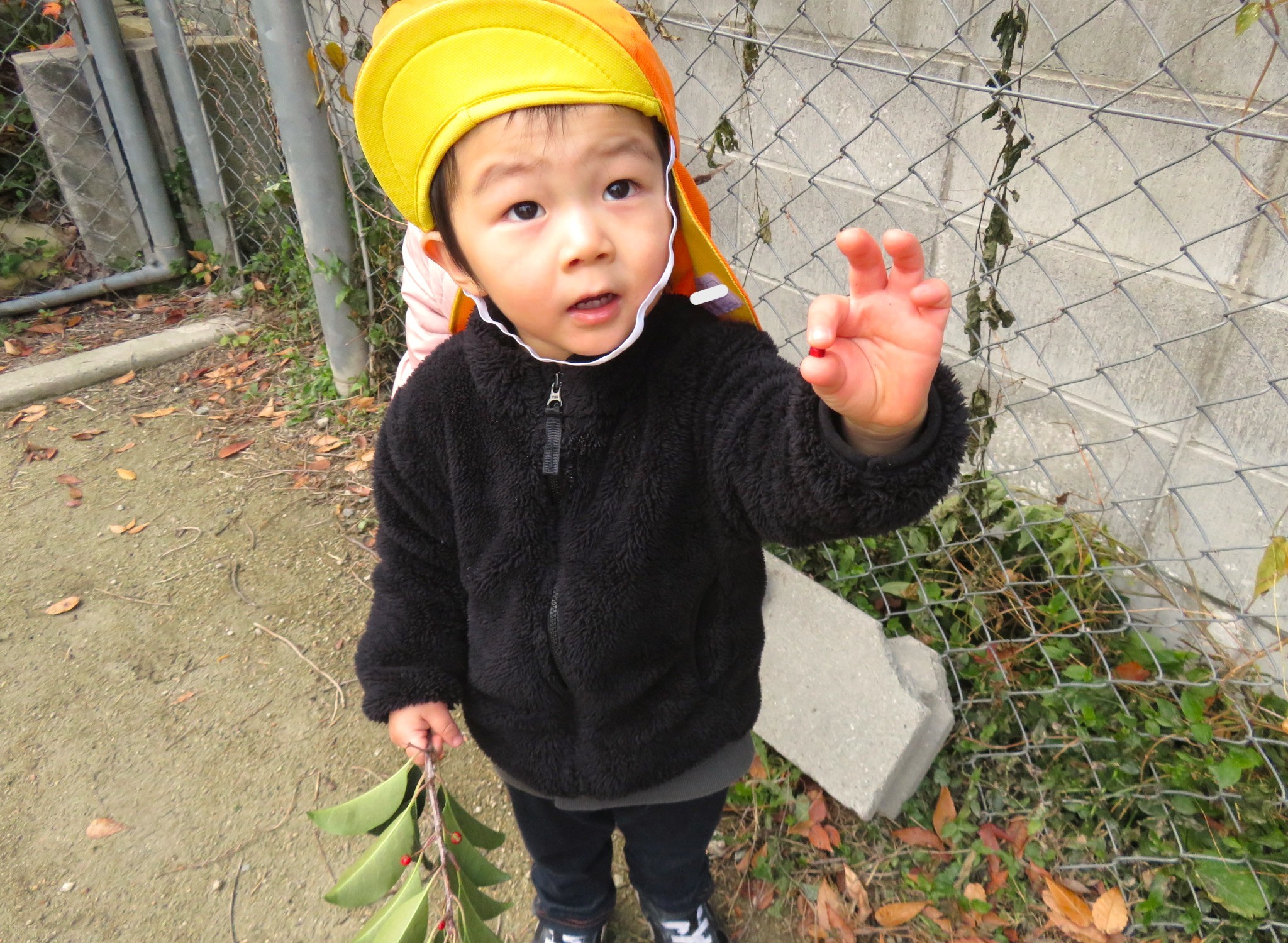 赤い実をつけた枝が落ちていたのを拾い、興味津々で観察する子ども達!!