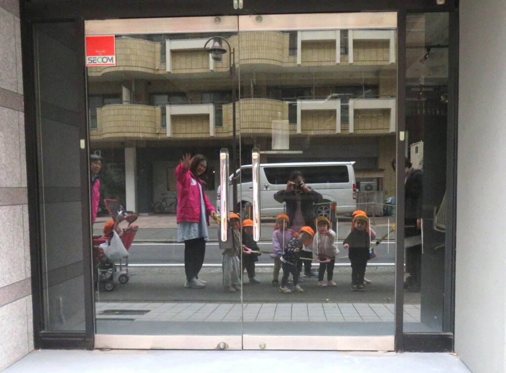 ガラス戸にうつる自分たちを見てポーズをしたりと