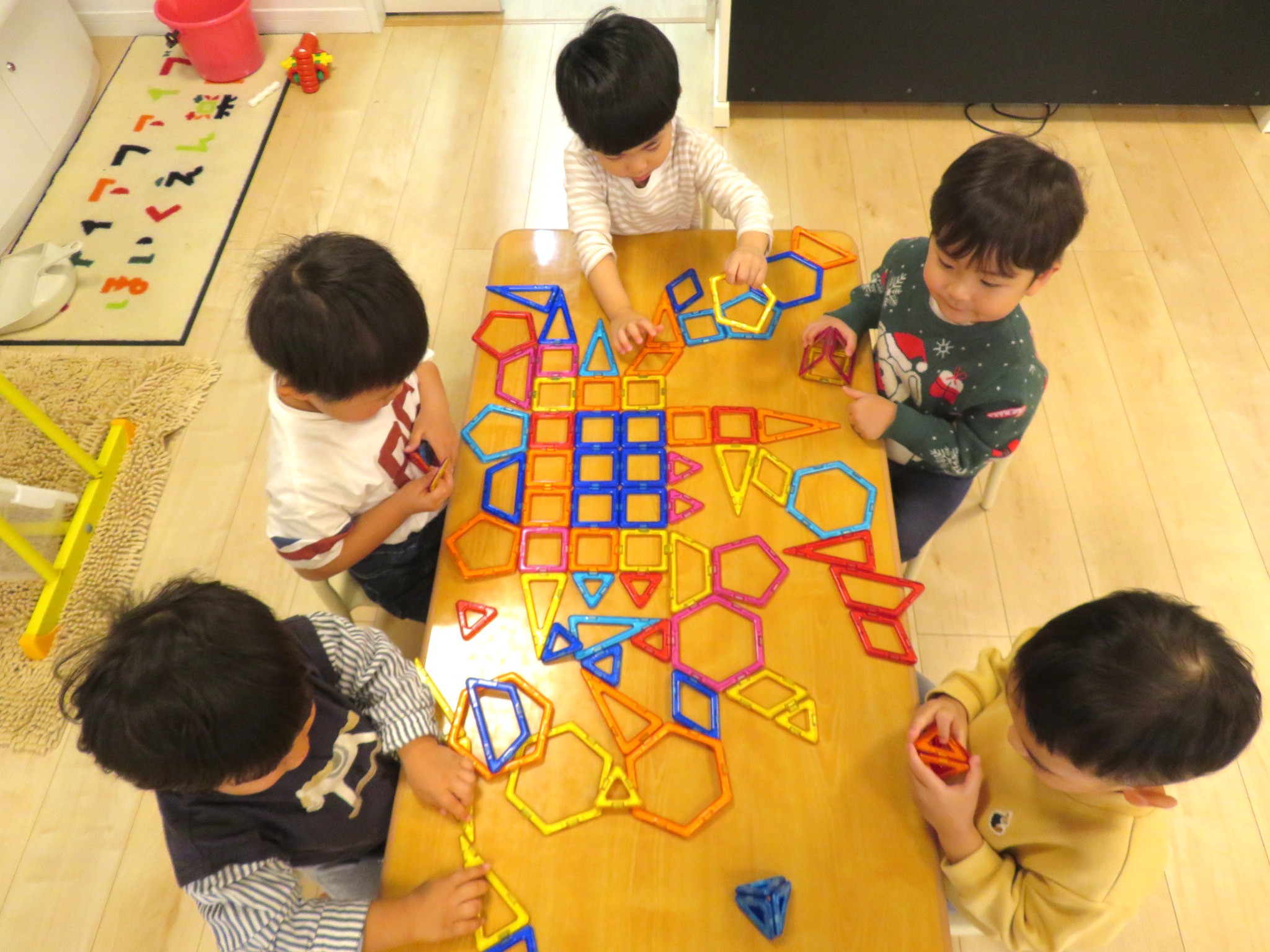 ご飯の後の自由あそびではマグフォーマーを使って、みんなで繋げて遊んでました✨