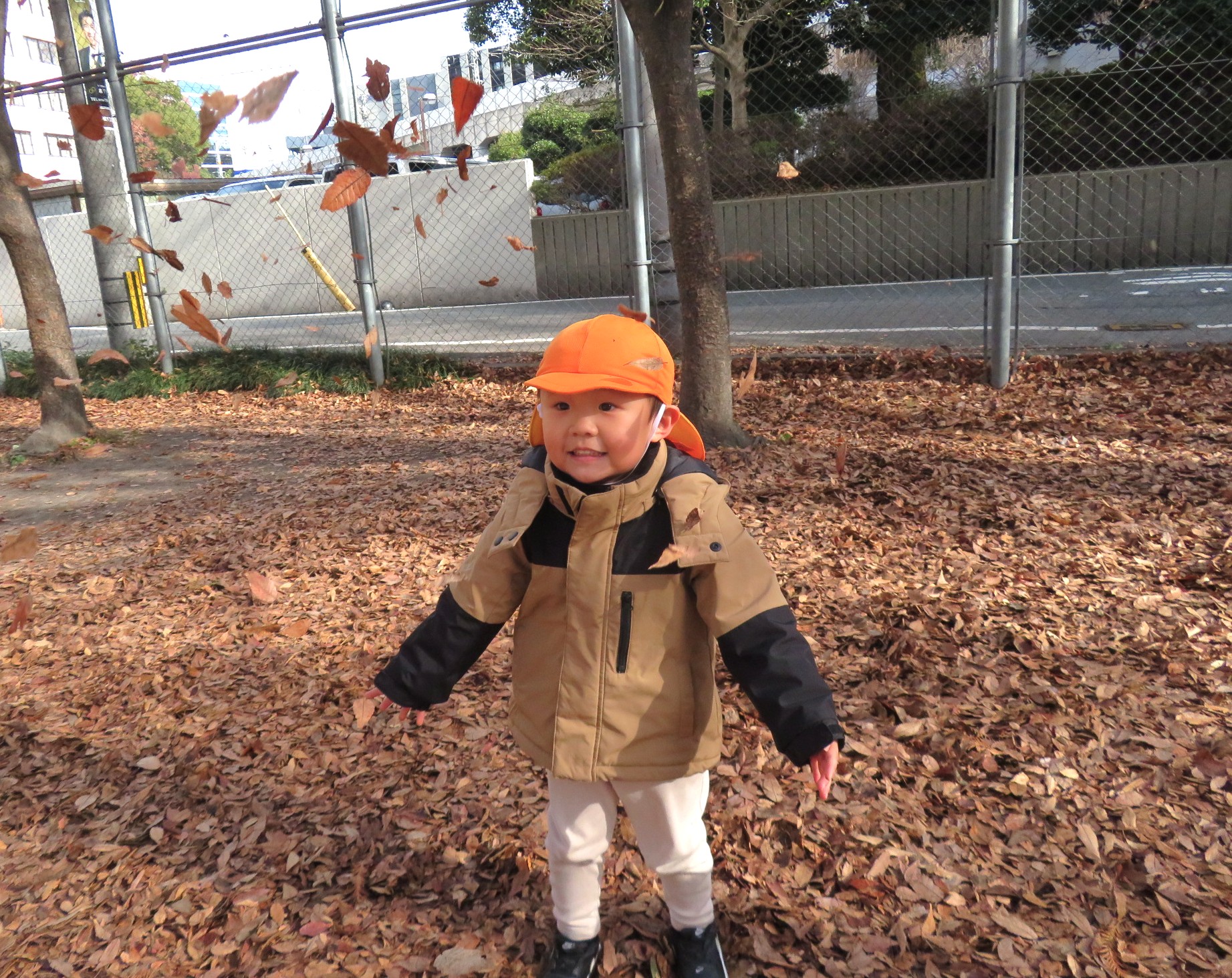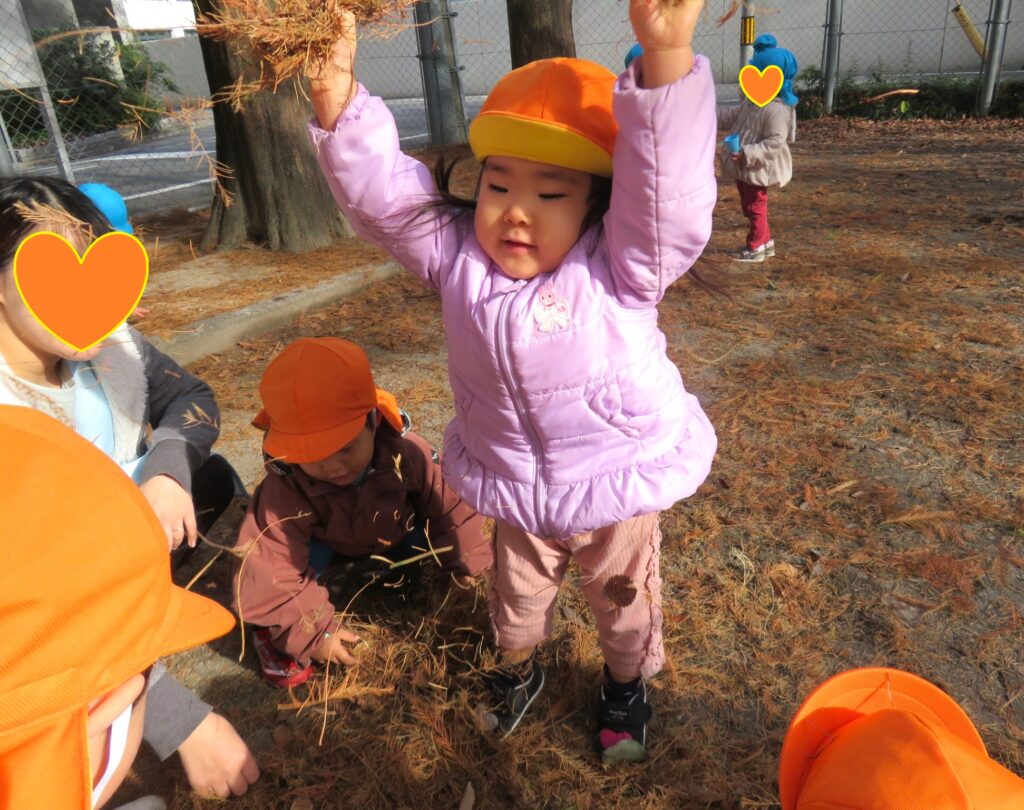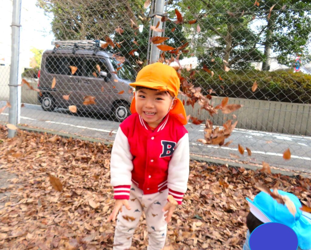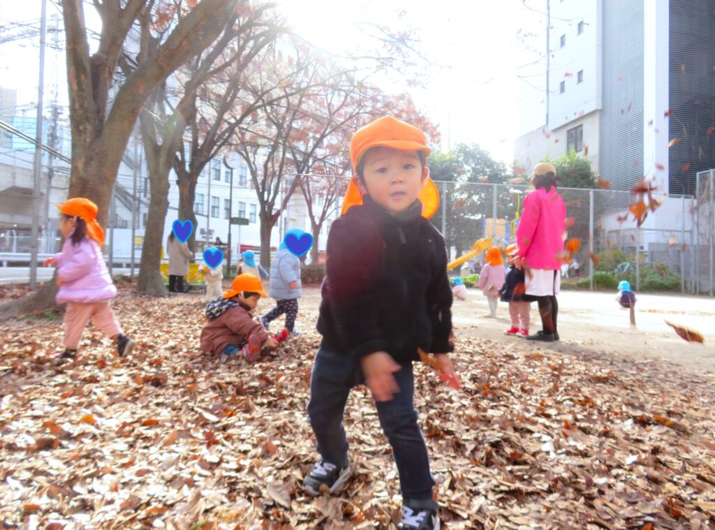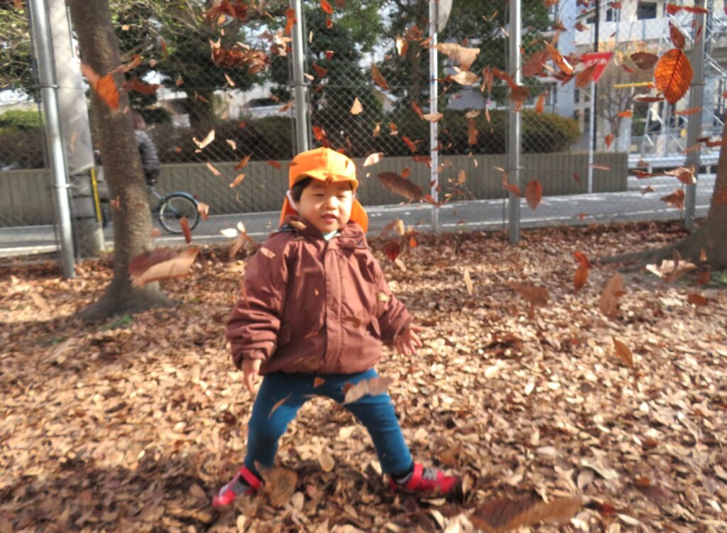 両手に大量の落ち葉を抱えて、豪快に散らす子ども達でした🍂😀