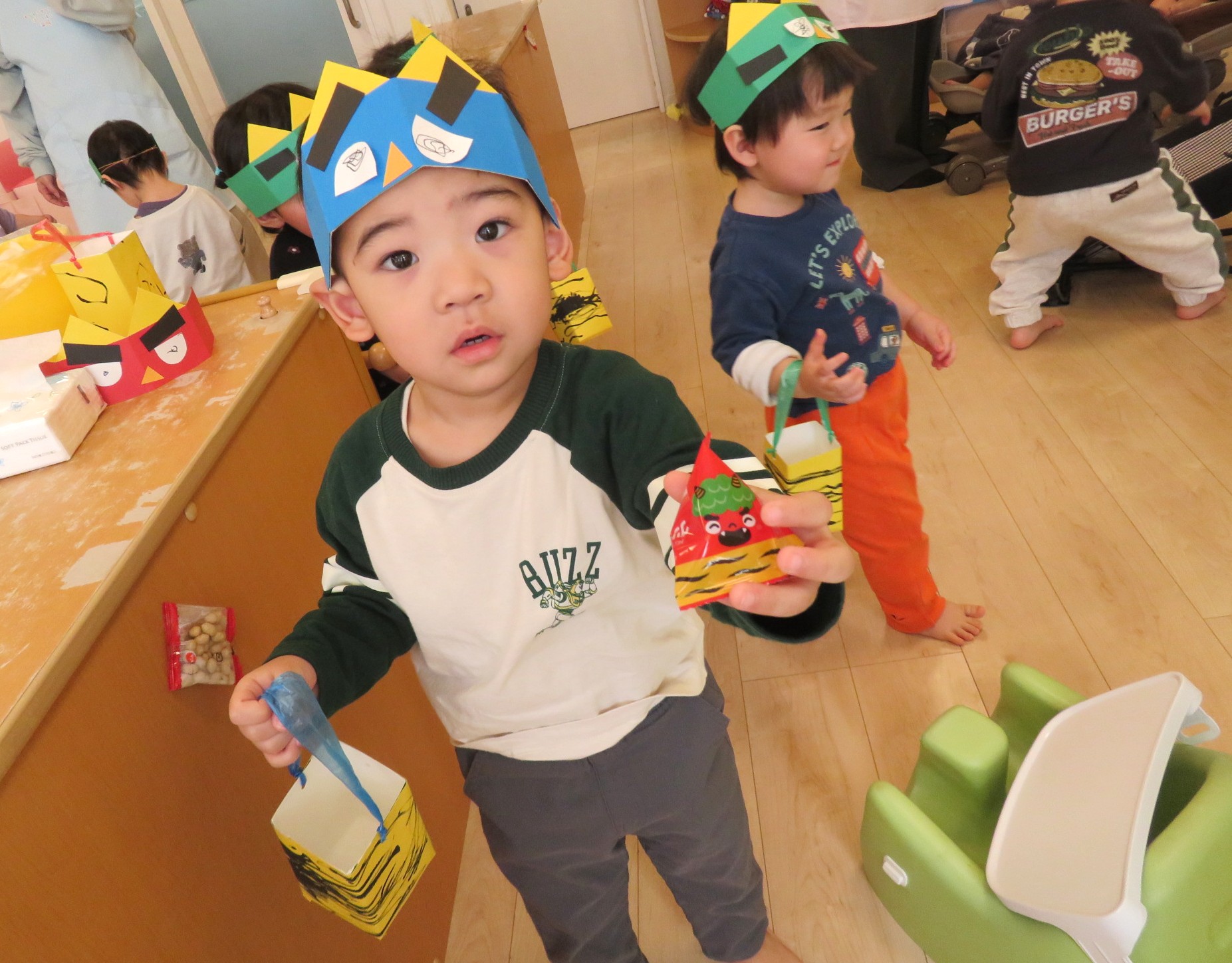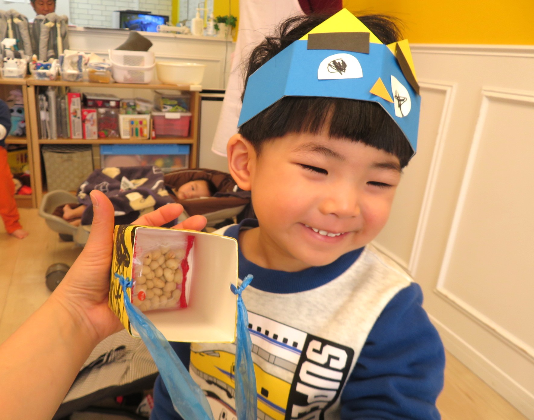 そしてこの日のために作ったお面と豆入れを装着❢❢