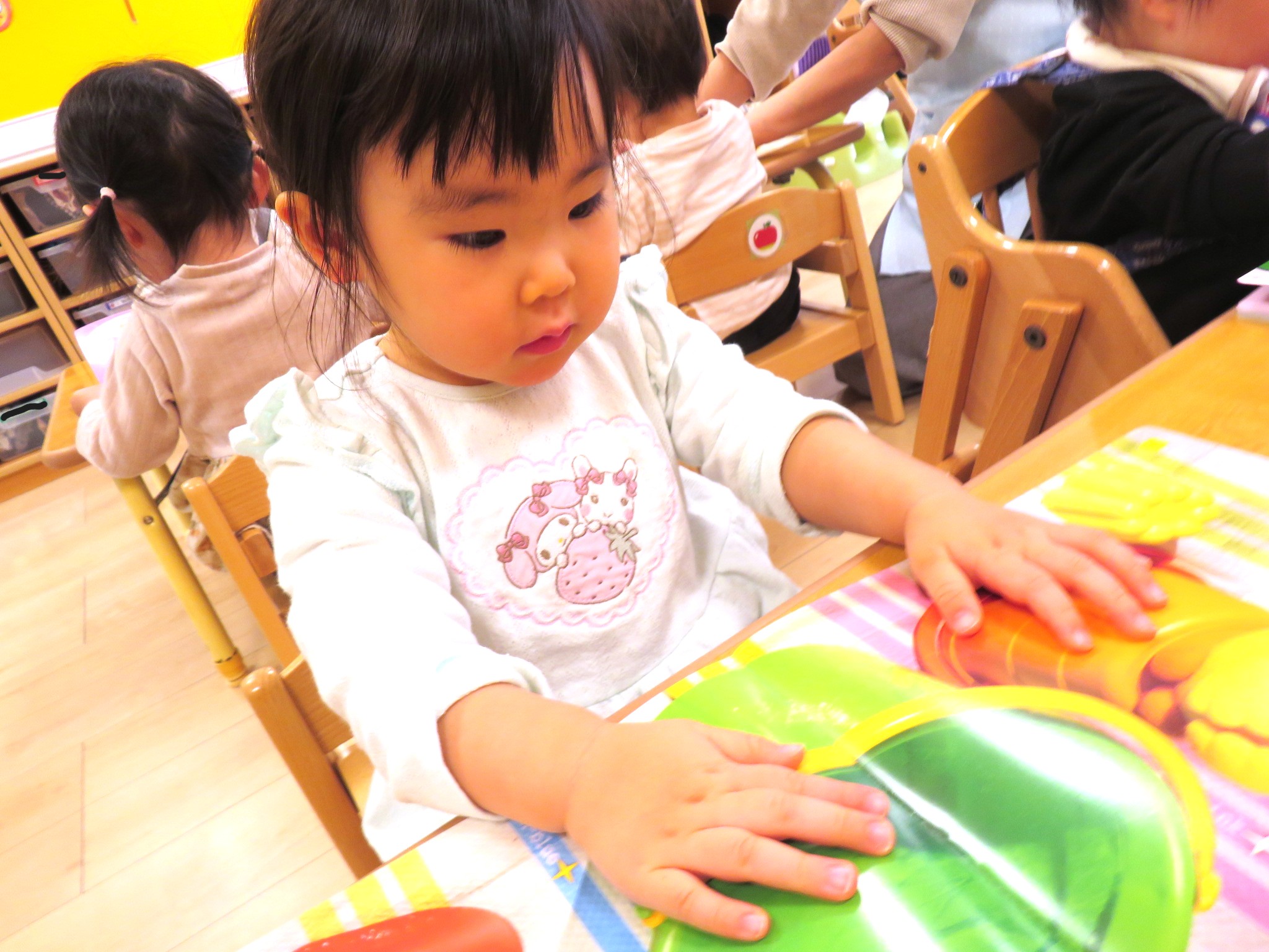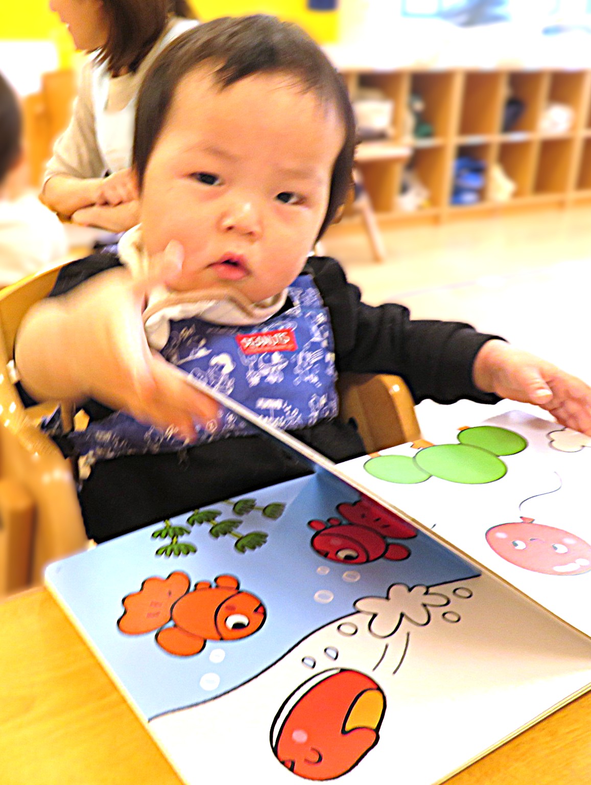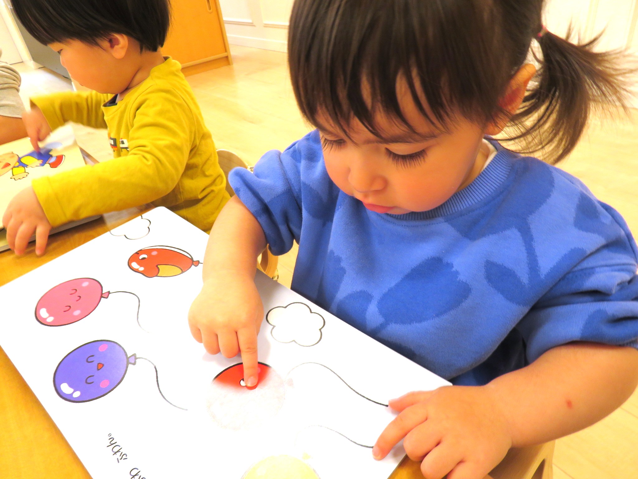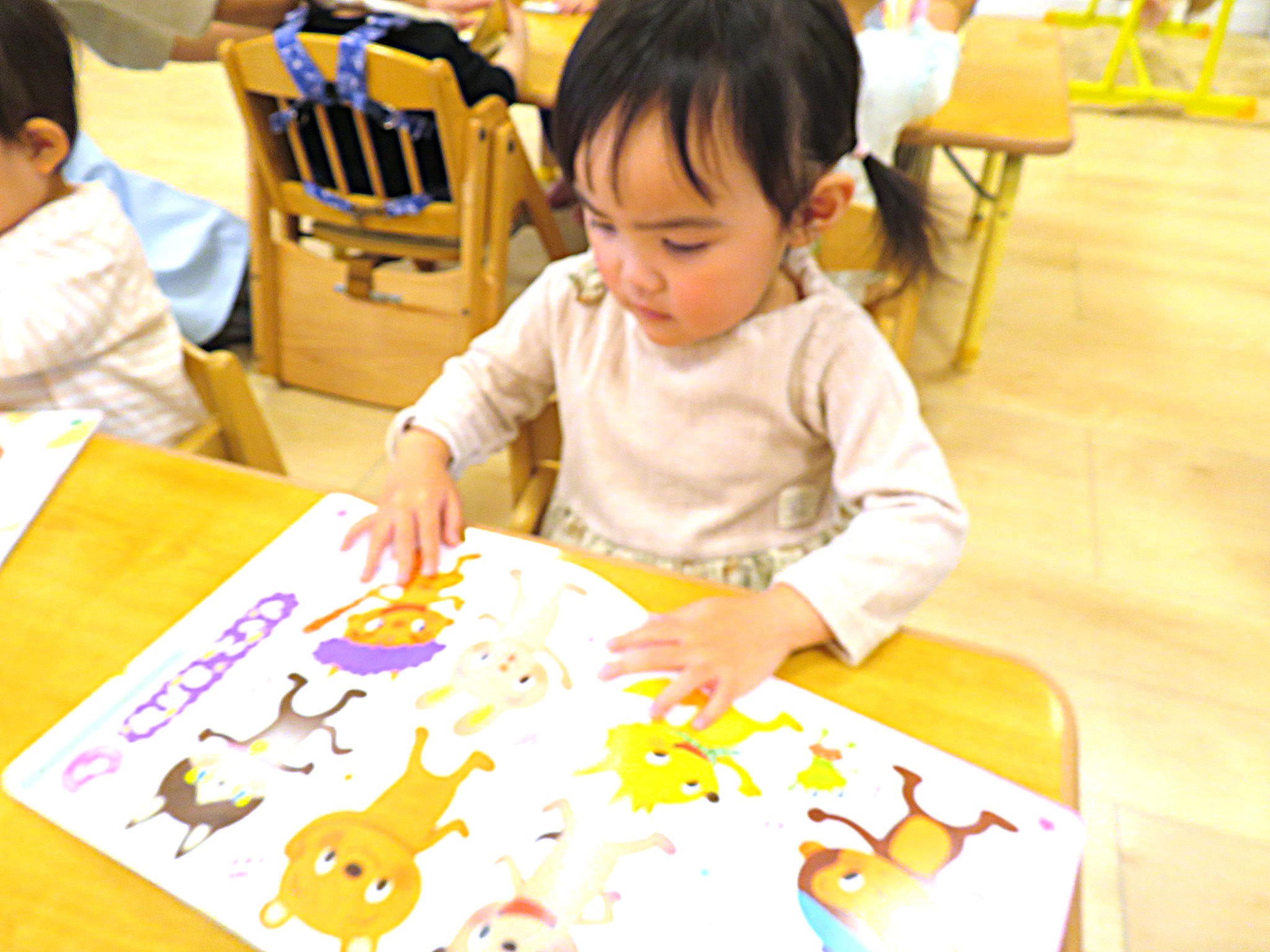 絵の名前を答えたり、シールを貼ったりと