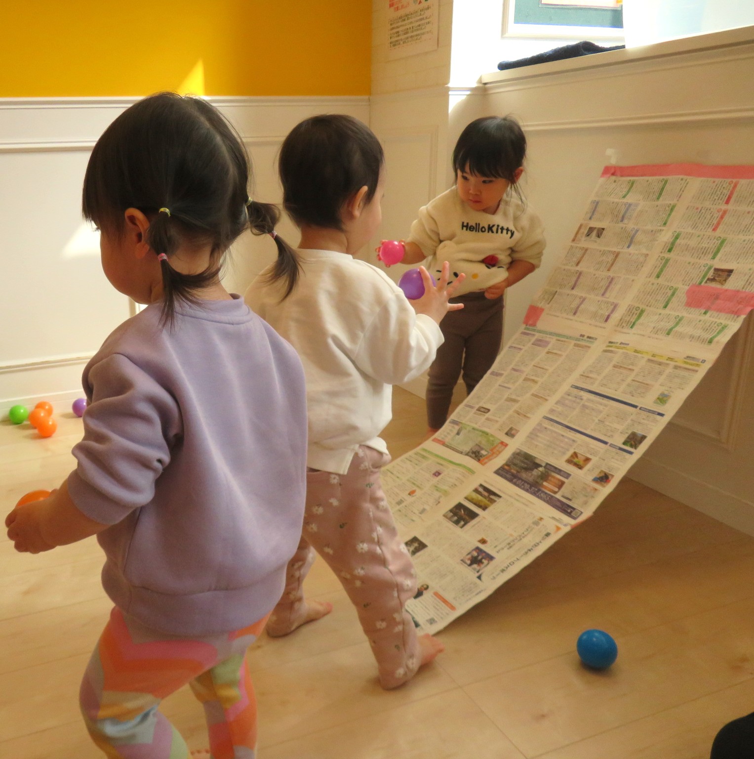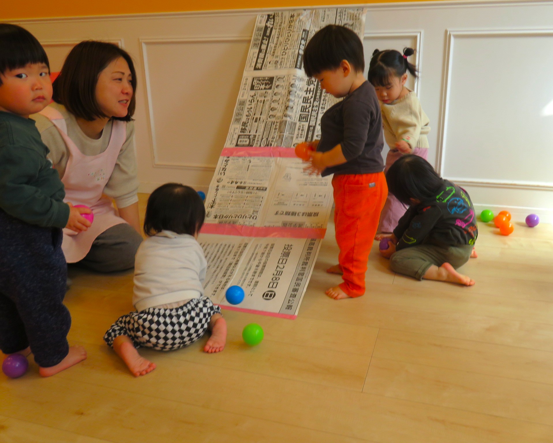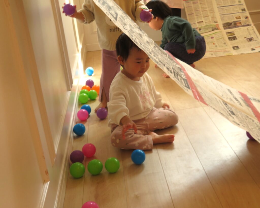 新聞紙の坂で転がしたり、服の中にボールを詰め込んだり・・・