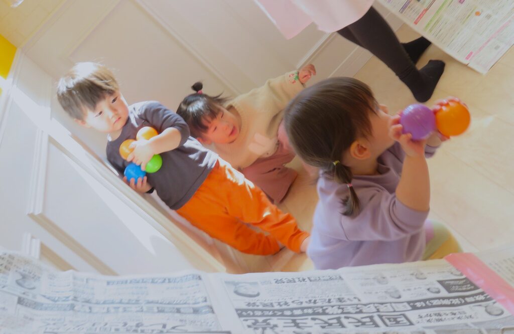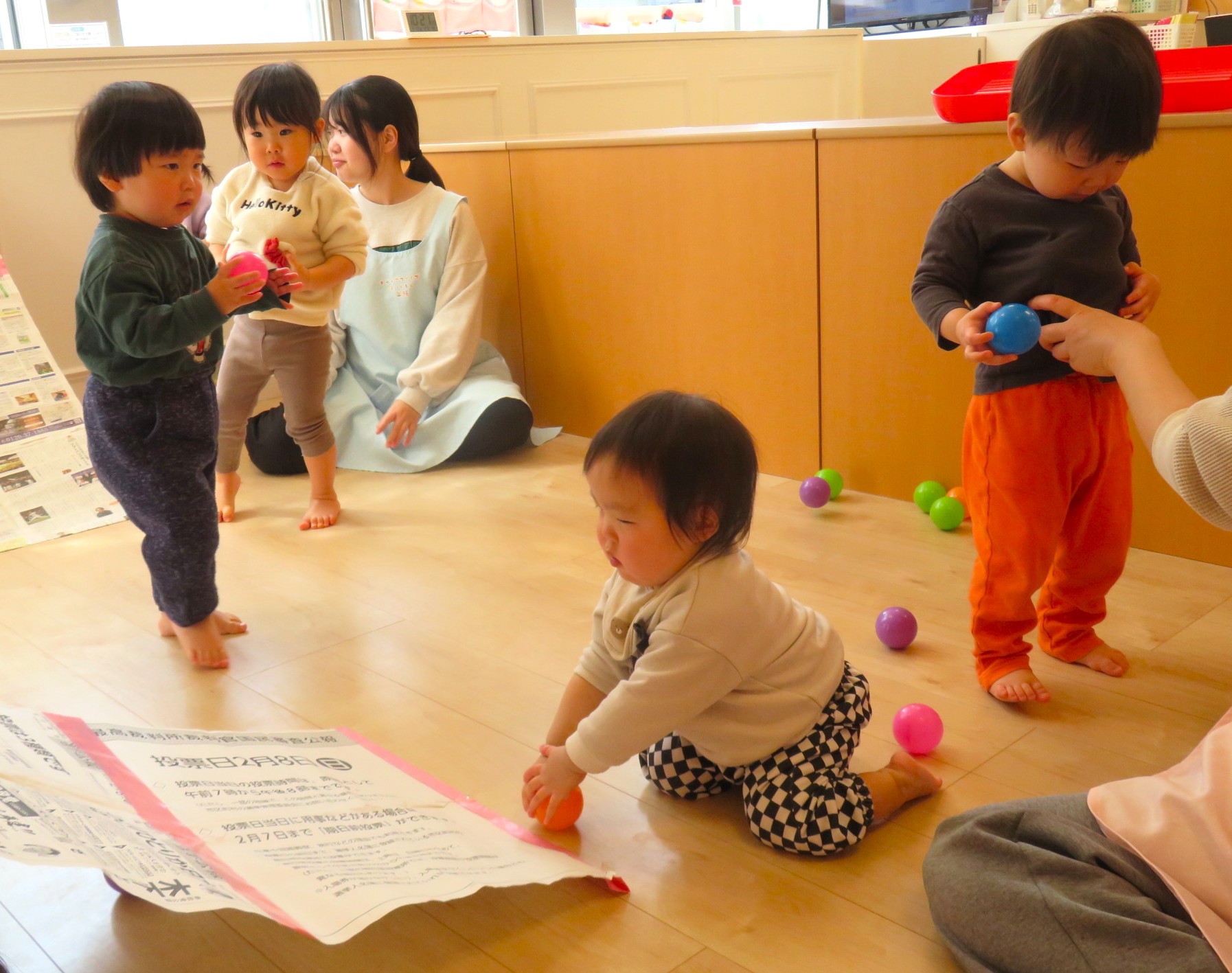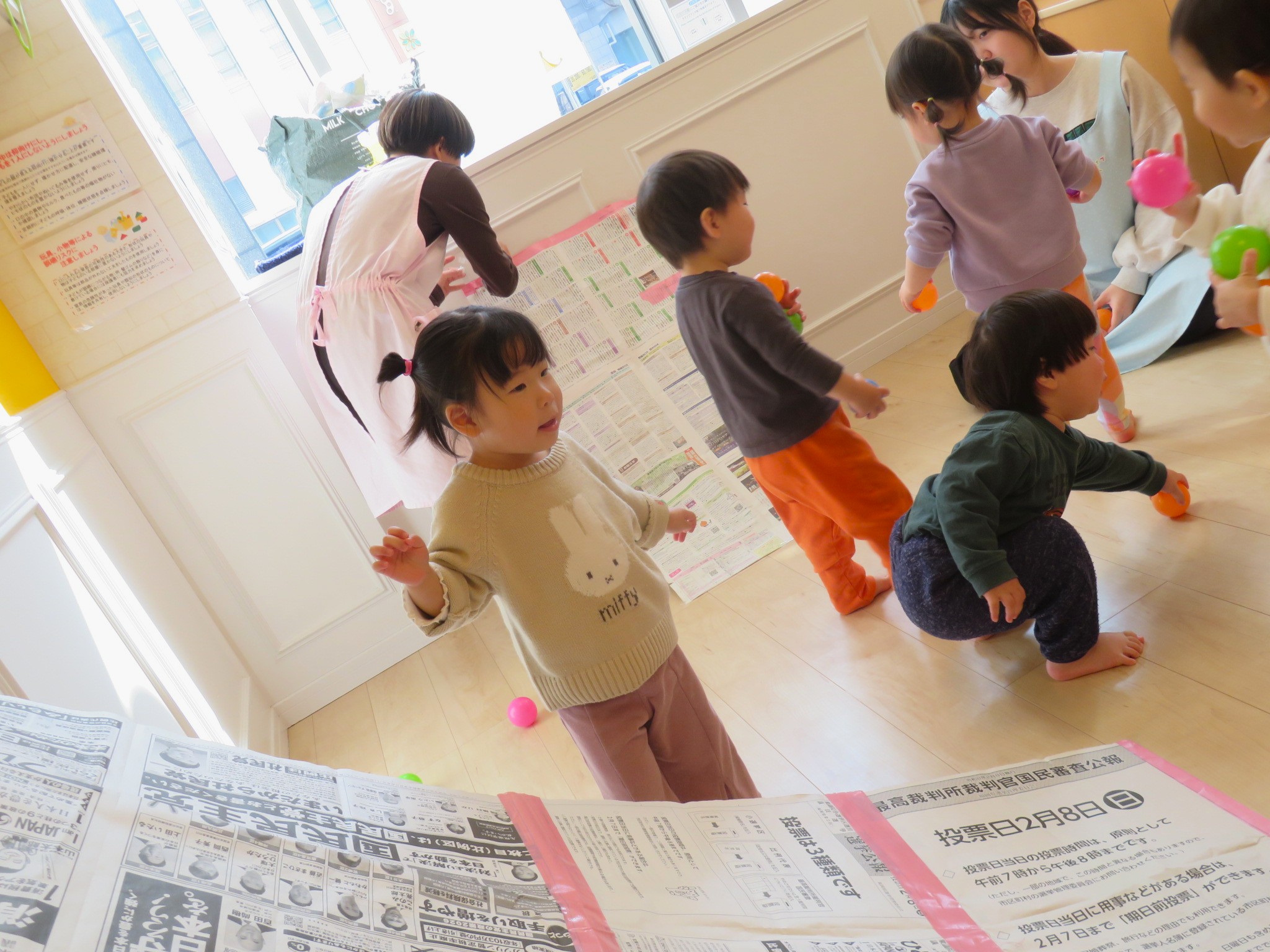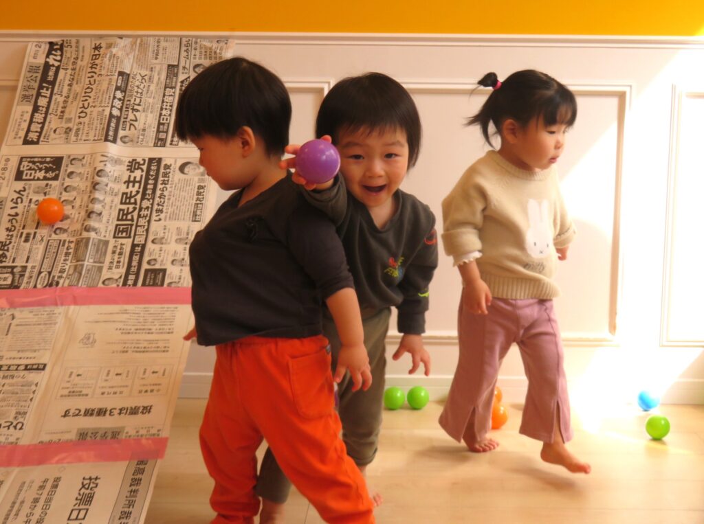 新聞紙の坂で転がしたり、服の中にボールを詰め込んだり・・・